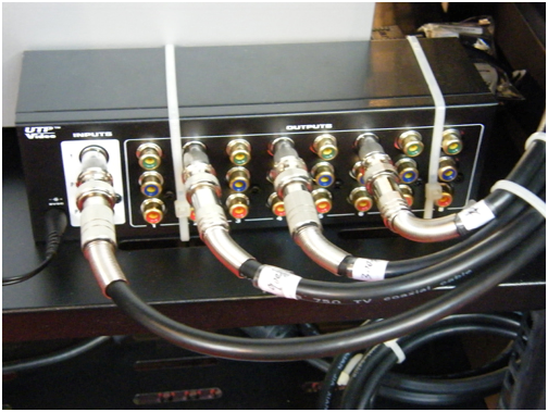 在VGA信號延長方面的展示平臺是利用優(yōu)特普高清VGA傳輸設(shè)備UTP816AT和UTP801AR作為演示產(chǎn)品,我們將UTP816AT分配出來的一路信號作為原始信號展示在一臺NEC的液晶屏上,另一路通過優(yōu)特普高清雙絞線傳輸設(shè)備延長300米后進(jìn)入另一臺同一品牌和同一信號的液晶屏上。