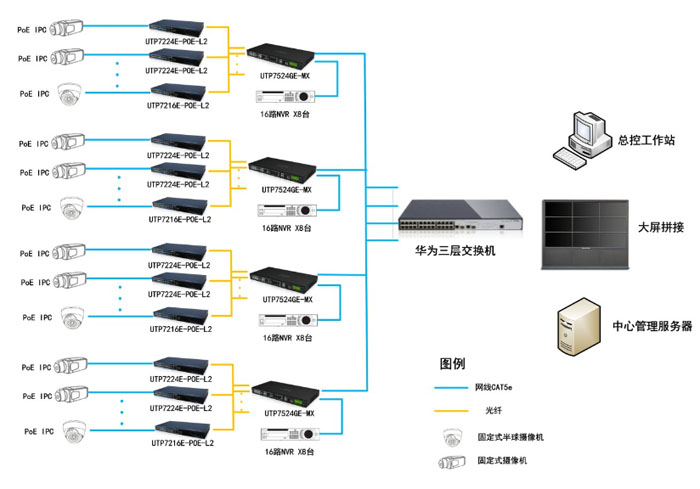 在接入層設(shè)備上,接入交換機(jī)采用優(yōu)特普24口PoE接入交換機(jī)UTP7224E-POE-L2、優(yōu)特普16口PoE交換機(jī)UTP7216E-POE-L2進(jìn)行網(wǎng)絡(luò)高清攝像機(jī)的網(wǎng)絡(luò)信號(hào)接入及網(wǎng)絡(luò)攝像機(jī)的供電,每個(gè)交換機(jī)的端口可最高輸出30W功率,完全可以滿足一般攝像機(jī)的供電需求,通過一根網(wǎng)線同時(shí)傳輸網(wǎng)絡(luò)信號(hào)及電源信號(hào),簡(jiǎn)化布線。