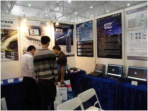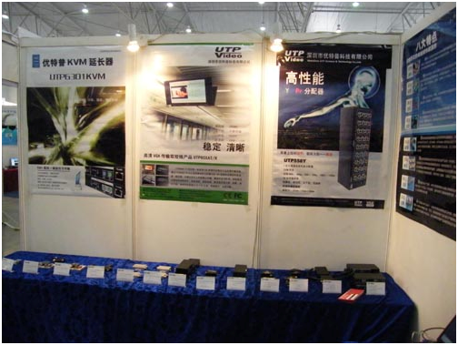 工作人員介紹相關(guān)產(chǎn)品,本次優(yōu)特普共在展會現(xiàn)場展示了安防監(jiān)控系統(tǒng)產(chǎn)品的演示效果和高清VGA延長系列產(chǎn)品的演示效果。