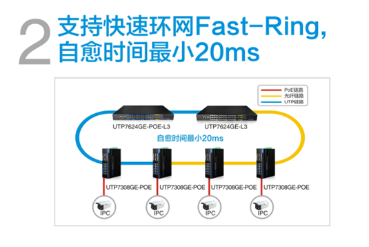 產(chǎn)品支持快速環(huán)網(wǎng)fast-ring,系統(tǒng)自愈時間最小為20ms,有效應(yīng)對網(wǎng)絡(luò)傳輸過程中的斷網(wǎng)問題,確保系統(tǒng)的穩(wěn)定可靠,保障網(wǎng)絡(luò)數(shù)據(jù)傳輸安全。