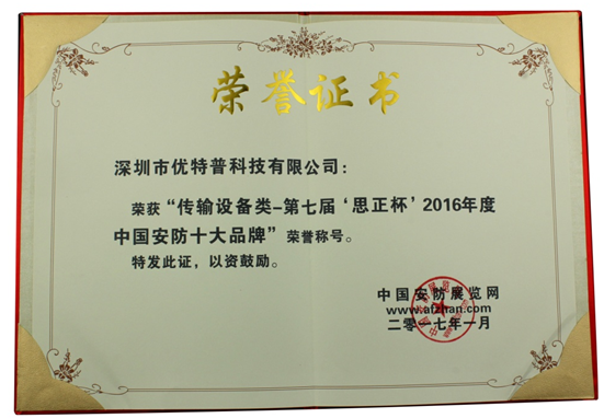 優(yōu)特普三年連獲“安防十大品牌”獎