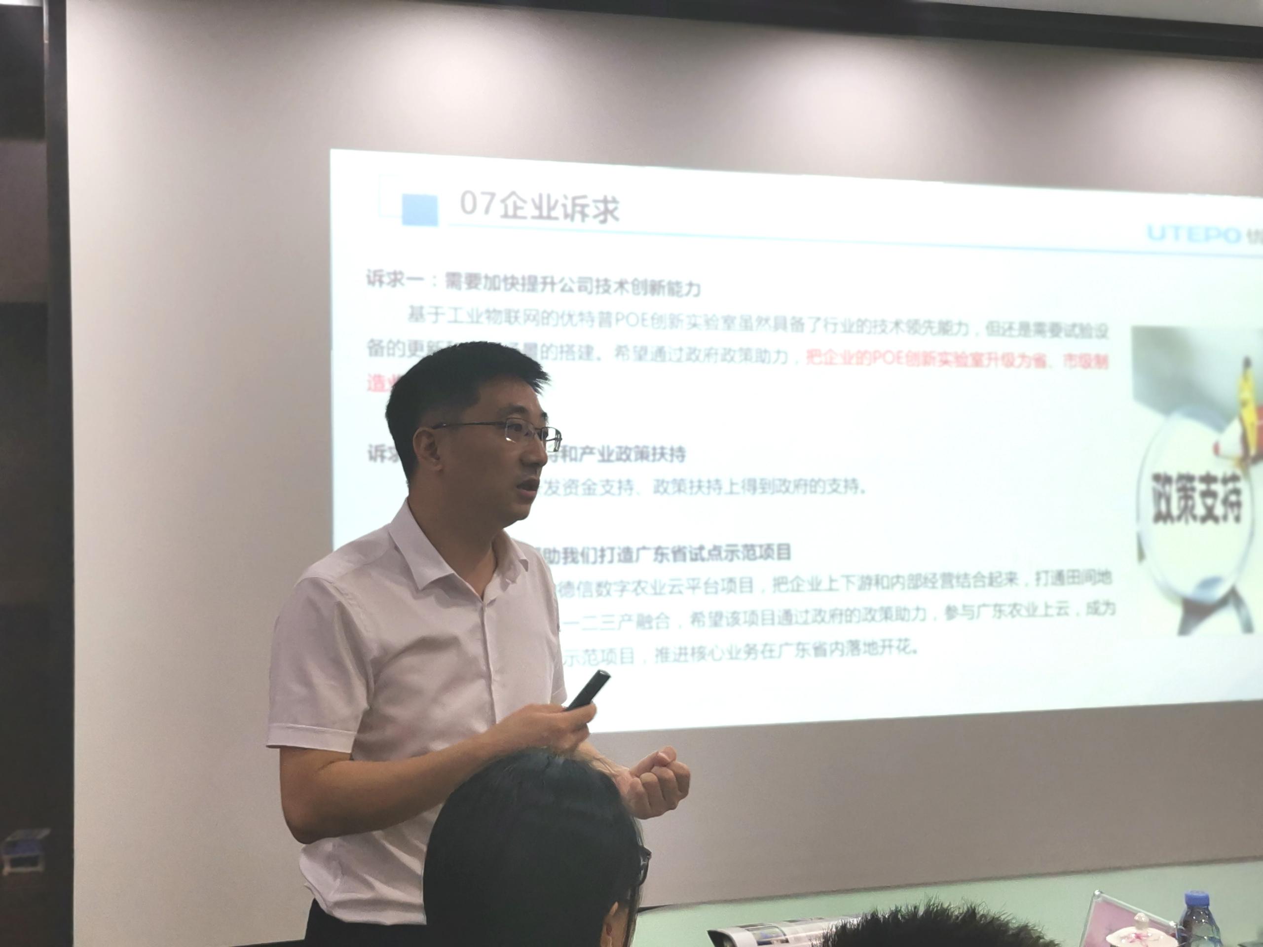優(yōu)特普董事長(zhǎng)聶懷東陪同來(lái)訪領(lǐng)導(dǎo)們參觀了優(yōu)特普總部辦公區(qū)、PoE創(chuàng)新實(shí)驗(yàn)室、物聯(lián)網(wǎng)通信實(shí)驗(yàn)室、研發(fā)中心,并向調(diào)研組領(lǐng)導(dǎo)詳細(xì)介紹了優(yōu)特普公司14年的發(fā)展歷程,科技創(chuàng)新成果、標(biāo)準(zhǔn)參與情況、業(yè)績(jī)?cè)鲩L(zhǎng)情況,并重點(diǎn)介紹了優(yōu)特普創(chuàng)新項(xiàng)目——“網(wǎng)電速聯(lián)(EPFAST)云平臺(tái)”和“德信數(shù)字農(nóng)業(yè)物聯(lián)網(wǎng)云平臺(tái)”。
