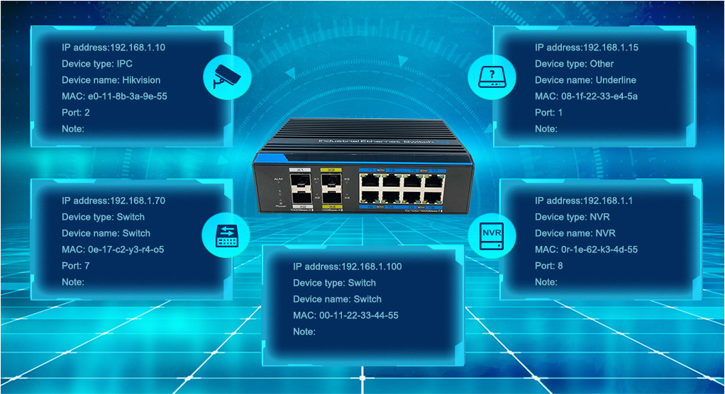 UTP7612S-PSD360支持ONVIF協(xié)議,可以自動(dòng)識(shí)別支持ONVIF的IP攝像機(jī)、網(wǎng)絡(luò)視頻錄像機(jī)(NVR)和其他支持ONVIF的IP設(shè)備,如網(wǎng)絡(luò)視頻解碼器等。通過LLDP協(xié)議在WEB界面自動(dòng)生成一份虛擬拓?fù)湟晥D,用戶可以通過拓?fù)鋱D了解其網(wǎng)絡(luò)連接的設(shè)備信息,如IP地址、設(shè)備類型、設(shè)備名稱、MAC地址等。