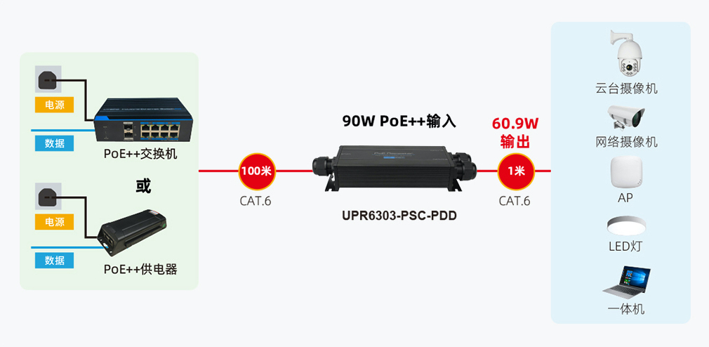 該工業(yè)級(jí)PoE中繼器可以提供最大90W的PoE輸入功率,輸出功率為60.9W(50V~57V),可供槍機(jī)、無線AP、球機(jī)、LED燈、桌面一體機(jī)等設(shè)備使用。