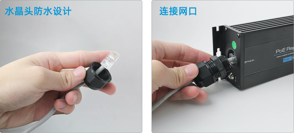 支持桌面式和墻面安裝。采用了特殊設(shè)計(jì)的防水頭,可以讓RJ45水晶頭直接穿過,輕松連接RJ45網(wǎng)口,而不需要進(jìn)行水晶頭焊接。