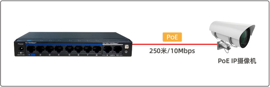 CCTV:下聯(lián)端口速率降為10M,最遠傳輸距離延長至250米。該模式下支持PoE看門狗功能。