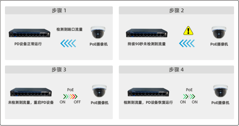 支持PoE看門狗功能(僅VLAN和CCTV模式下),實現(xiàn)PoE攝像機掉線自動偵測、自動重啟,減少系統(tǒng)維護成本。