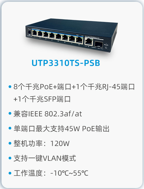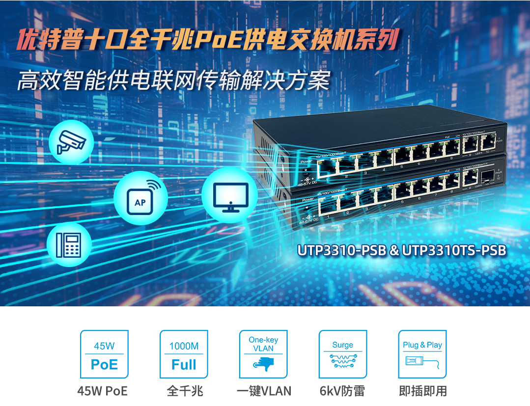 優(yōu)特普10口全千兆PoE交換機(jī)系列是具有高性能和可靠性的網(wǎng)絡(luò)交換機(jī),可為網(wǎng)絡(luò)設(shè)備提供穩(wěn)定的供電和數(shù)據(jù)傳輸質(zhì)量。其中UTP3310-PSB交換機(jī)可提供8個(gè)千兆R(shí)J-45以太網(wǎng)端口,2個(gè)千兆R(shí)J-45上聯(lián)以太網(wǎng)端口。UTP3310TS-PSB交換機(jī)可提供8個(gè)千兆R(shí)J-45以太網(wǎng)端口,1個(gè)千兆R(shí)J-45和1個(gè)千兆SFP上聯(lián)以太網(wǎng)端口。所有下聯(lián)端口兼容IEEE 802.3af/at PoE標(biāo)準(zhǔn),單端口具備提供高達(dá)45W的“高功率”供電能力,可滿足高功率需求的設(shè)備,如網(wǎng)關(guān)、無(wú)線AP等設(shè)備的供電需求。該系列交換機(jī)體積小巧、易于安裝,是滿足各種設(shè)備供電需求和網(wǎng)絡(luò)數(shù)據(jù)傳輸?shù)睦硐脒x擇,也是企業(yè)和機(jī)構(gòu)打造高效網(wǎng)絡(luò)的重要設(shè)備。