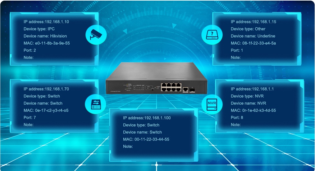 該產(chǎn)品支持ONVIF協(xié)議,可自動(dòng)識(shí)別支持ONVIF的IP攝像機(jī)、網(wǎng)絡(luò)視頻錄像機(jī)(NVR)和其他支持ONVIF的IP設(shè)備,如網(wǎng)絡(luò)視頻解碼器等。通過LLDP協(xié)議在WEB界面自動(dòng)生成一份虛擬拓?fù)湟晥D,用戶可通過拓?fù)鋱D了解其網(wǎng)絡(luò)連接的設(shè)備信息,如IP地址、設(shè)備類型、設(shè)備名稱、MAC地址等。
