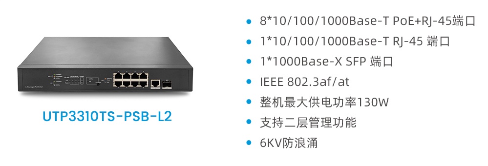 產(chǎn)品提供8個(gè)全千兆PoE供電端口,單端口可提供最大30W功率,符合IEEE 802.3af/at標(biāo)準(zhǔn),可為IP終端(如IP攝像機(jī)、IP電話、AP等)提供穩(wěn)定、可靠、節(jié)能、安全的供電保障。上行端口配備1個(gè)千兆以太網(wǎng)RJ-45端口和1個(gè)千兆以太網(wǎng)SFP端口,大大擴(kuò)展了設(shè)備的使用范圍,用戶可根據(jù)實(shí)際應(yīng)用需求靈活組網(wǎng)。