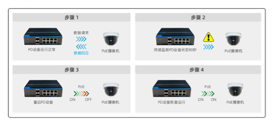 PoE Watchdog(看門狗),實現(xiàn)PoE攝像機掉線自動偵測、自動重啟,減少系統(tǒng)維護成本。