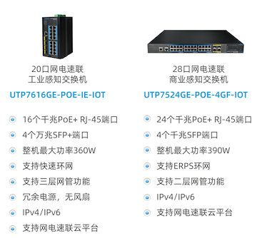 優(yōu)特普提供多端口匯聚、核心交換機,產品支持豐富的二層、三層網管功能,在可用性、可擴展性和安全性方面具有良好優(yōu)勢。搭配可視化運維綜合管理平臺(網電速聯(lián)云平臺),網絡管理員可對交換機、網關、攝像機、傳感器、智慧桿等物聯(lián)設備的網、電數(shù)據(jù)進行全方位管理。